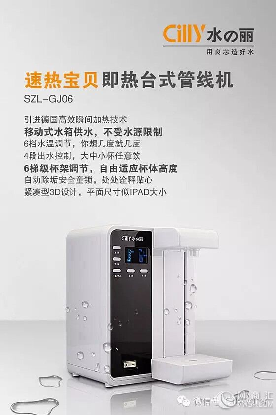 有、有、有,这次真的有了!面对“有没有温度可以调节的管线机,因为冲奶粉和泡茶,需要的温度是不一样的?”“有没有精致小巧的管线机,不占空间,我可以随心所欲地放在台面上使用?”“如果我办公室没有水源,您怎么可以解决让我能快捷地喝上安全健康的水?”等等系列需求时,CILLY水の丽GJ06“速热宝贝”管线机给出了肯定的回答!速热宝贝采取移动式水箱供水,平面尺寸酷似IPAD大小,可以随性在办公桌或餐桌上放置,而且它还是即开即热型的,无需等待出热水。从即日起,集万千宠爱于一身的CILLY水の丽GJ06速热宝贝管线饮水机已经轻盈上市,360度接受检阅。 “’速热宝贝很轻盈,一眼就爱上它了,无论在我的办公室还是家里都适合使用,我得马上把它带走!”时尚达人王小姐对新鲜事物一直都保持着很强的接受力。当然,CILLY水丽净水推出的这款“速热宝贝”即热型台式管线饮水机自然有其独特的内涵和外在的美貌的并存,所以才讨人喜爱。 速热宝贝厉害的当然就是核心的加热技术了,它引进的是德国陶瓷化金属加热管技术,导热性能好,热效率高,加热管寿命长,而且加热管长期使用不会变形爆裂,更无异味,2秒出开水,即开即饮,无需漫长等待烧开。 其次,水丽速热宝贝TM温控技术也是独门绝技,6段温度控制,让你自由选择出水温度。生活条件提升了,生活态度就得认真了,在源水过滤净化干净的基础上,我们也不能再一个温度烧到底了,分温度供水是必不可少的。而这款机器可就解决您的这个需求了。比如您想喝常温水,直接喝,不用加热。而家里有宝宝的,需要随时冲泡奶粉,45度左右基本就可以了,免去了您等开水冷却或者调水温的麻烦。冲蜂蜜喝的水温一般要控制在60度,否则就破坏了蜂蜜的营养成分。而冲咖啡和绿茶的温度,一般在80-90度之间为理想。如果您早晨冲麦片,90度以上的温度还是需要的。咱家CILLY水丽净水推出的此款“速热宝贝”正好设定了“常温、40、70、80、90、100”这六个温度档位,立体满足了您按需温控加热的需要。生活品质由此大大跨越哦! 虽然CILLY水丽净水新上市的GJ06“速热宝贝”迷你的身材看上去很萌,但主人在孕育它的时候,在细节上可花费了不少硬功夫。首先,它采取的是“移动式水箱”设计,这就解决了一些写字楼办公室,家庭的一些房间没有水源也不好布设管线的问题,只需把水箱一提哪里有水源就去哪里接水,不再受场地的限制了。而且别看个头小,水箱可不小哦,有2L的容量呢,接完水后往机器上一放,您就慢慢品吧。 第二,安全童锁功能的设置,完全杜绝了“熊孩子”们因好奇而误操作可能存在的烫伤风险。在儿童锁启用后,小朋友按机器,就只能出常温水了,无惧、无惧。而机器自带的自动除垢功能,更是进一步延长了加热管的寿命,体现了机器内外兼修的卓越品质。 当然,第三点更体现出了速热宝贝的“细微之处见真功”的厉害之处。看看接水的杯托,很有创新创意点哦。CILLY水の丽“速热宝贝”采取的是可移动式的杯托架。不仅如此,而且还是6个层级高度的杯托架,可以根据您使用的杯子的高度自由调节杯子的托架高低,以充分适应您的杯子的高度。不仅如此,根据您杯子的大小,速热宝贝也对应采取了4段出水设计,150ml、200ml、300ml、500ml,全面适应迷您杯、小杯、中杯、大杯的容量,不用担心水丽管线机杯满溢水的问题。处处为用户着想,天生就有追求的基因。 CILLY水丽净水推出的此款速热宝贝即热台式管线机,是一款典型的跨界产品,无论家庭还是写字楼里的办公室,都麻溜溜地适用。而且它还是礼品团购和馈赠亲友的绝佳拍档,一个单位或家庭有个几台速热宝贝使用,真的不多、不多。CILLYの水丽品牌家族新产品次第上市,在等待与您相约、相知。来,我们做朋友吧!