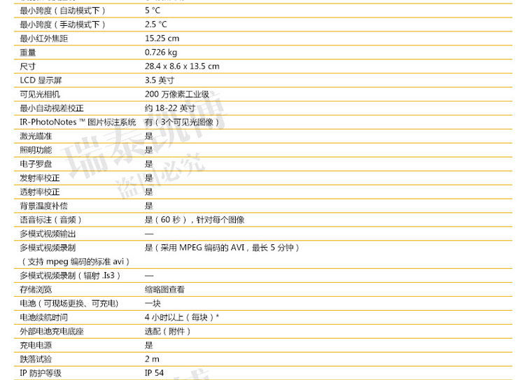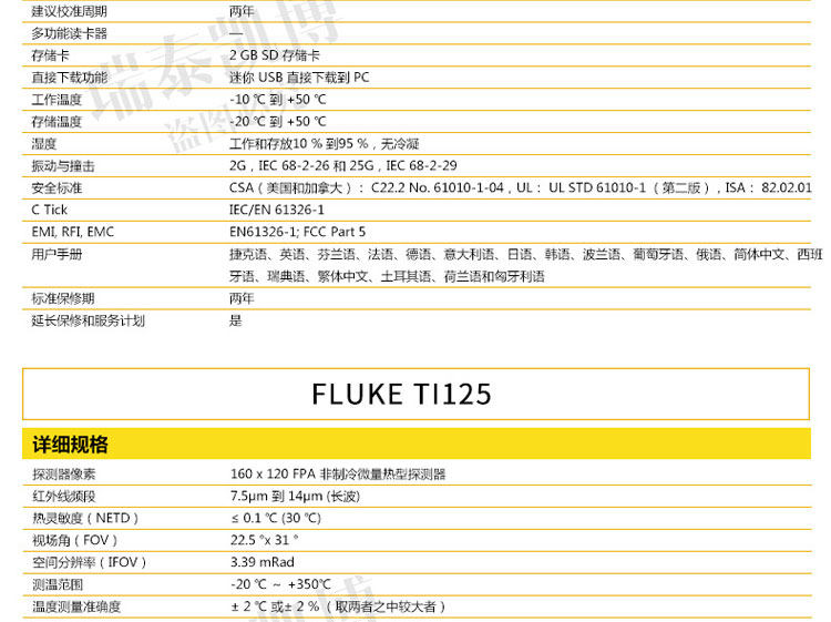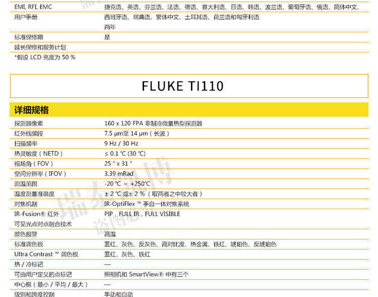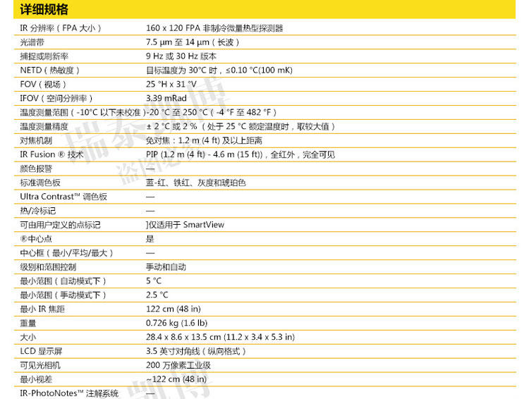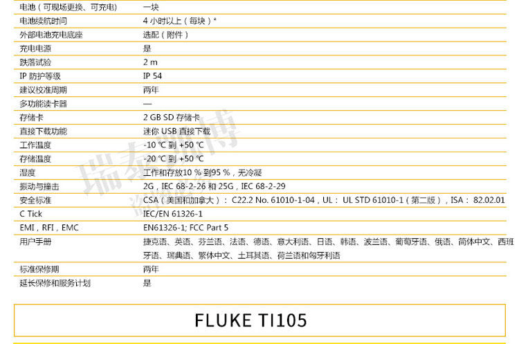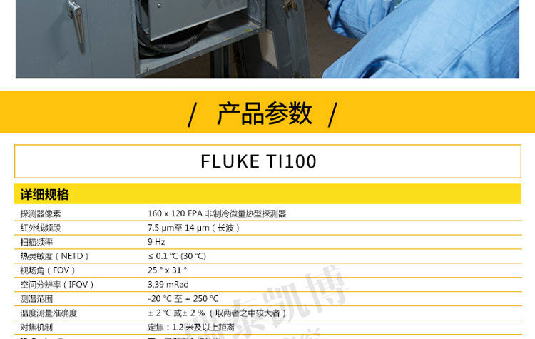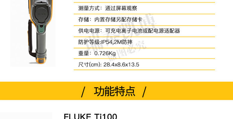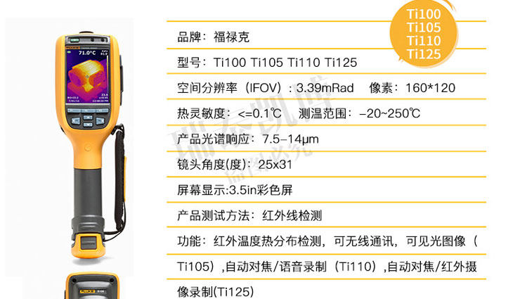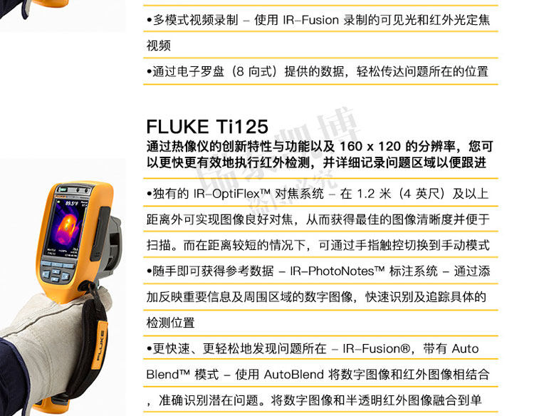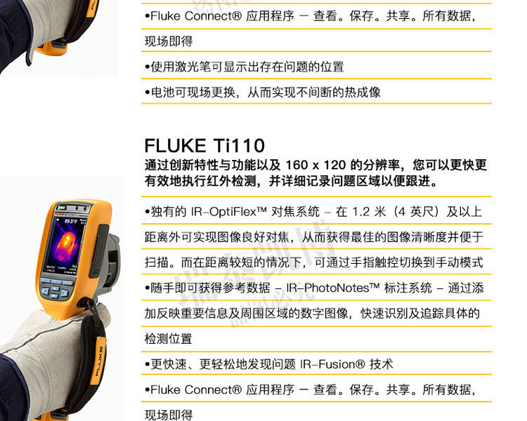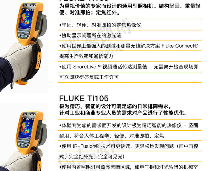 专为您设计的热像仪。 超光滑、智能化的设计可满足您的日常排障需求。 针对工业和商业技术人员对产品进行了性能优化,他们需要轻松地排除日常故障。 正如联系您一样,福禄克会与客户取得联系并询问他们的工作方式以及他们为了更快速、更简便地进行检查所需的功能 - Ti105 热成像仪是佳解决方案。通过查找潜在问题,Ti105 热成像仪可避免因故障导致的昂贵费用,从而节省您的时间和金钱。专为您设计的热像仪。 ? 体验 超光滑智能化设计 专为您开发的成像仪 - 坚固耐用、符合人体工程学、轻巧、对准即拍、免对焦 ? 使用 IR-Fusion? 技术 可更快速、更简易地发现问题所在(画中画模式、全红外、完全可见) ? 使用内置电筒可照亮黑暗区域,如电气柜和灯光昏暗的机室 ? 可使用激光指示器显示问题所在 ? 利用现场可更换电池实现不间断热成像 借助于 Fluke 超光滑 Ti105 工业用和商用热成像仪可更快速地发现问题,从而拥有更多的时间解决问题。 ? 体验专为您的需求而开发的设计极为精巧智能的热像仪 - 坚固耐用、符合人体工程学、轻便、对准即拍、定焦 ? 使用 IR-Fusion? 技术可更快速、更轻松地发现问题(画中画模式、完全红外光、完全可见光) ? 使用内置照明灯可照亮黑暗区域,如电气柜和灯光昏暗的机械室 ? Fluke Connect? 应用程序 – 查看。保存。共享。所有数据,现场即得 ? 使用激光笔可显示出存在问题的位置 ? 电池可现场更换,从而实现不间断的热成像 ? 使用 Fluke 极为精巧的 Ti105 工业-商业型热像仪,可在发现问题上花更少的时间,从而为解决问题留出更多时间。 所有商标均是其各自所有人的财产。 购买时不随附提供智能手机、无线服务和数据方案等。 5 GB 内存免费。 兼容运行 iOS 8 或更高版本系统的 iPhone 4s 及更高型号、iPad(iPad 上的 iPhone 版)和运行 Android? 4.4.x 或更高版本的 Galaxy S4、Nexus 5、HTC One。 Apple 和 Apple 的徽标均为苹果公司在美国和其他国家/地区注册的商标。 App Store 是苹果公司的服务标志,Google Play 是谷歌公司的商标。
