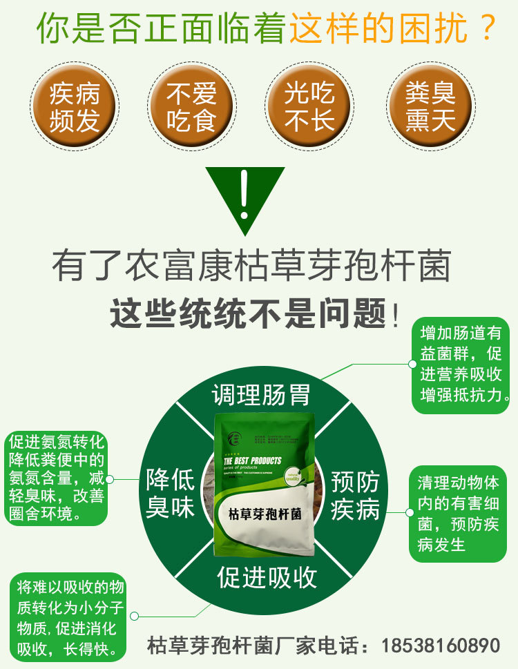 猪吃了枯草芽孢杆菌是不是长的快 在养猪行业越来越多的人开始关注抗生素的危害,发展无公害养殖业,生产绿色猪肉,寻找替代抗生素的枯草芽孢杆菌成为现在的当务之急。芽孢菌产品是一种健壮而处于休眠状态的活细菌,能耐受高温高压及酸碱,抗性强,储藏时间长,它无论在颗粒还是在粉料中,都比较稳定,也能顺利进入猪肠道成活并大量繁殖,成为微生物饲料添加剂中使用较为广泛的益生菌种。农富康猪用枯草芽孢杆菌厂家订购电话:185-3816-0890(微信同号)