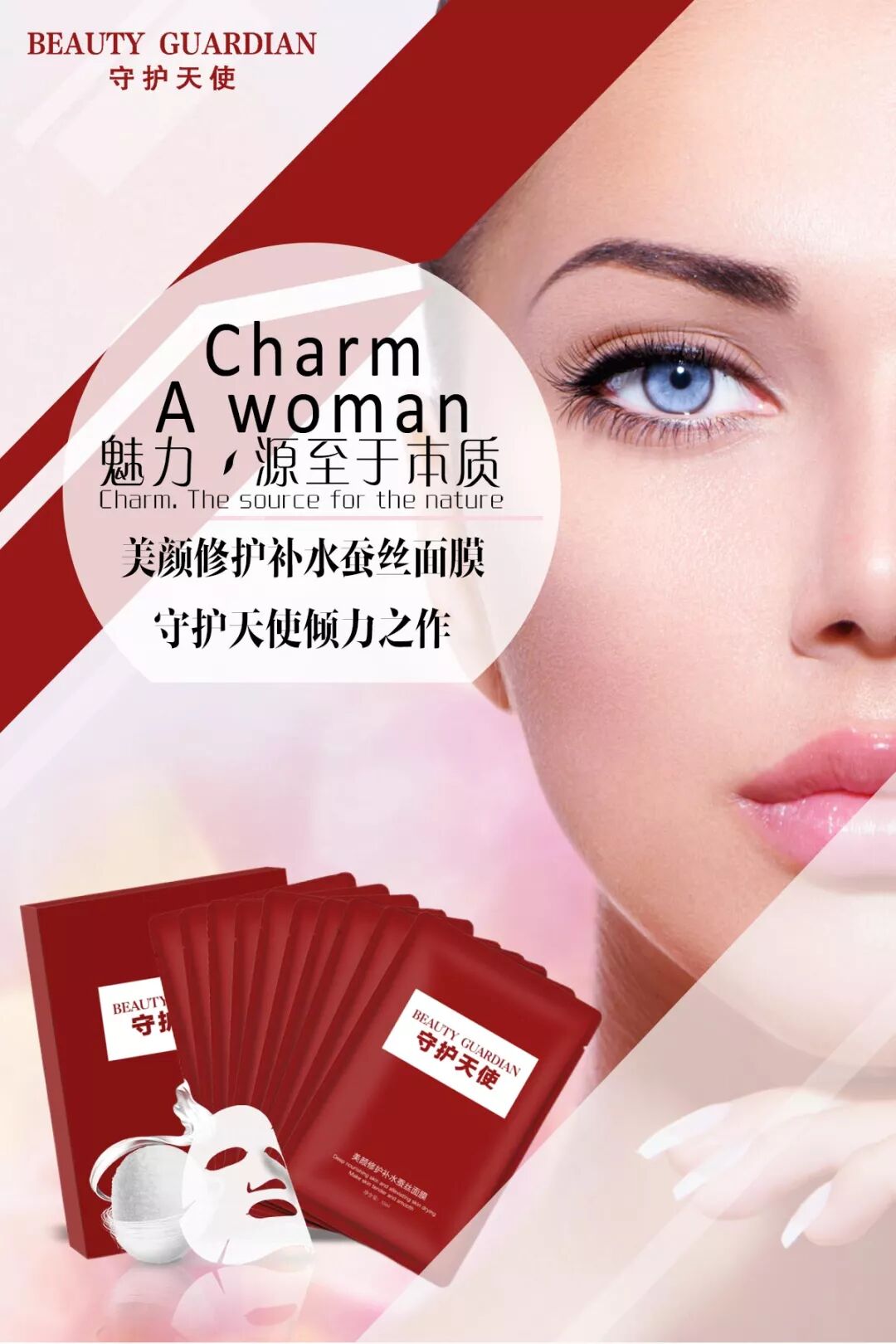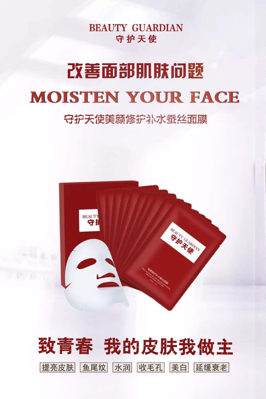 守护天使新品面膜全国震撼上市!守护天使倾力之作,聚势未来,赢领天下,守护天使,膜力全开! 这是一款面膜,一款真正大牌体验,平民价格的良心产品! 带着这样的理念,为了全面满足市场及客户不断改变和提升的需求,现在我们正式推出新品面膜守护天使美颜修护补水蚕丝面膜 面膜的市场很大,基本上每个女人就算不化妆,不用化妆品都会用护肤品,不用护肤品,都会用面膜,可以说面膜就是爱美女人的命一样重要!!! 而面膜的市场大,所以市场形形色色的面膜也特别的多,而消费者真正需要的就是一款高品质,高性价比的面膜,大家都是需要好用又便宜的面膜。而我们守护天使是做别人还没有做到的事情,做别人还没有做好的事情。包装高大上,品质更好,效果更好,性价更高的面膜已经面世! 守护天使面膜是一款真正源自天然植物提取的安全护肤面膜。成分的原料是韩国进口的,签约韩国(株)丹鼎生物公司为原料供应商,其中主要成分有母菊花提取物,密罗木提取物。 而母菊花是中药的一种,可以用入药,能够抗过敏,解决肌肤干燥问题,保持肌肤水润。 密罗木的提取物能偶让细胞重焕新生,只要水相互结合,就能让肌肤细胞重新补水,非常强大的一种修复功效的成分。 面膜中的超强保湿因子,透明质酸,也就是俗称玻尿酸的成分。使肌肤超强补水,增强肌肤弹性,防止老化,让肌肤越来越有光泽 守护天使的膜布制作是 一片式的膜布采用独特超薄蚕丝面膜布制作,多孔性纤维蚕丝有出色的锁水功能,采用铜氨短纤材料及植物纤维素纤维,材质可自然降解,安全环保不变形采用水刺交叉工艺而成,均匀释放精华液,深入肌肤里层补充水分。灌装精华液后能轻松敷于脸部不变形,面膜布--轻、透、薄、服帖,柔顺透明 ,软滑舒适,给肌肤百般呵护,如凉风拂面隐形,贴肤隐形效果佳,完全贴于面部,感觉如清澈泉水,与肌肤颜色基本一致,可以紧密贴敷于脸部肌肤,从而达到膜面合一。敷在脸上看不出来敷面膜一样,特别的服帖。 面膜蚕丝布的四大特点: 1、天然蚕丝 温和护肤:天然工艺加工,温和不刺激,不含任何的石化纤维和黏胶,对肌肤零刺激无负担,天然蚕丝材质,温和护肤 2、蚕丝材质 完美服帖:柔软蚕丝材质,完美贴合肌肤,有弹性,更服帖。天然蚕丝比无纺布面膜更有弹性和韧性,敷脸上可以根据不同的脸型拉伸调整尺寸,使之照顾到肌肤的各个角落,完美贴合肌肤的轮廓。吻合肌肤纹理、眼角、嘴角,都一样服帖,柔软而有弹性,紧致肌肤。 3、锁水性好 吸水性强:柔软丝滑,肌肤更好吸收。 真丝光泽和丝滑柔软的手感,良好的吸水性,能吸附精华液,从而更好导入肌肤。天然透气让肌肤享受丝滑柔滑细腻的敷膜感受。强力吸附精华液,使精华充分吸收,为肌肤深层补充营养,锁住肌肤水分,让肌肤永葆莹润光彩。 守护天使面膜功效特点:主要针对补水保湿,淡斑、祛黄、超强锁水、美白抗衰、高效修复、紧致弹力 美丽女人守护天使面膜 多种补水保湿成分,长效保湿,帮助肌肤补充水分,修护肌肤因缺水引起干燥,粗糙等状况,增加肌肤弹性,长期使用肌肤细腻光滑。 1.保护肌肤 皮肤薄弱部位上,会发生免疫反应并出现皮肤发红。因此守护天使可预防皮肤发红并防止对角质层的损害。 2.修复肌肤 由于皮肤发红和失水导致损害角质层及引起皮肤炎症。为肌肤注入活力保湿因子,温和调理肌质,提高肌肤洁净度与柔软度。 3.清理肌肤 皮肤在空气污染会丧失皮肤屏障功能。守护天使能清除在空气中吸附的微粒子、有害空气、细菌等污染物。守护天使专注天然护肤理念,传承以植物、矿物等天然安全成分为基础,专为消费者打造高品质、性价比高的产品。为现代东方女性奉献优越品质的美颜护肤保养品。
