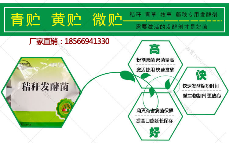启富玉米秸秆发酵剂有效提高玉米秸秆的适口性 一提到秸秆大家想到的可能就是焚烧秸秆污染环境,但是玉米秸秆也是很好的饲料来源。许多的养牛户都会在冬天储存玉米秸秆 过冬,让牛即使在冬天也能吃上新鲜可口的草料。但是玉米秸秆直接喂牛的话不仅牛不爱吃,而且不容易消化,容易导致牛的腹泻拉稀,不利于牛的生长,同时玉米秸秆也不容易存放。但是呢玉米秸秆又是很好的饲料,弃之可惜。但是我们可以使用启富玉米秸秆发酵剂来提高秸秆做牛饲料的功效,降低危害。 启富玉米秸秆发酵剂是一种玉米秸秆专用的发酵剂,是由多种有益菌复合而成的有益微生物制剂,不含激素和化学成分,是一种生物制剂,发酵后的秸秆做饲料喂 牛能改善适口性,提高营养,同时也变得容易消化。 启富秸秆发酵剂的好处: 1.转化粗纤维提高饲料利用率:玉米秸秆发酵剂中的有益功能菌,经过培育活化后,可以快速分解,分解玉米秸秆饲料中的粗纤维,木质纤维素,把不易吸收的多糖转化为有益氨基酸,提高 玉米秸秆饲料的口感,促进牛肠胃对饲料的消化吸收,提高玉米秸秆饲料利用率 2.增加牛采食量:经过发酵的玉米秸秆饲料,质地柔软,味道酸甜,有果香味,牛爱吃,采食量提高20%-40%,长肉快,长势好,可以提前5-7天出栏。 3.提高免疫力少生病:发酵后的玉米秸秆中含有大量的有益菌,当进入牛肠道后,这些有益活菌可以牛肠道里面的有害病菌,改善牛肠道微生态平衡,提高 牛机体免疫力,少生病,从而降低用药量,节约药费。 4.圈舍无臭蚊蝇少避免污染:有益微生物菌可以帮助牛肠胃促进对饲料中氨,氮的分解,减少粪便中的含量,从而降低牛粪的臭味,改善养殖环境。 5.延长玉米秸秆饲料保存时间,避免营养流失:使用玉米秸秆发酵剂发酵的玉米秸秆,可以更长时间的保存,杜绝霉变,保鲜保质,避免 玉米秸秆中营养物质流失。 启富秸秆发酵剂 黄贮的用法: 启富厂家每年都会接到成千上万的秸秆发酵剂的订单,深受广大客户的喜爱,效果好,质量优,价格优惠(厂家直销成本价),菌种都是实验室的原种,繁殖速度快,菌群活性高,因而效果好,你的不二之选。厂家直销:18566941330(微信同号)胡先生