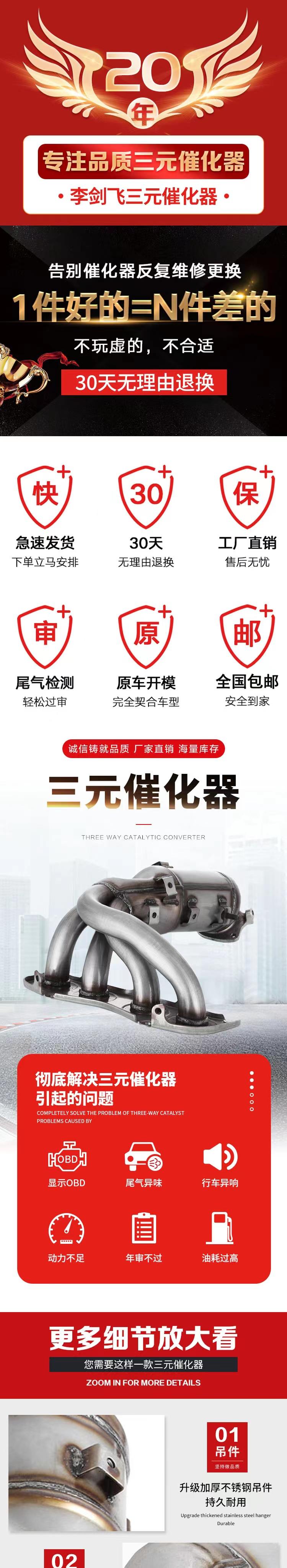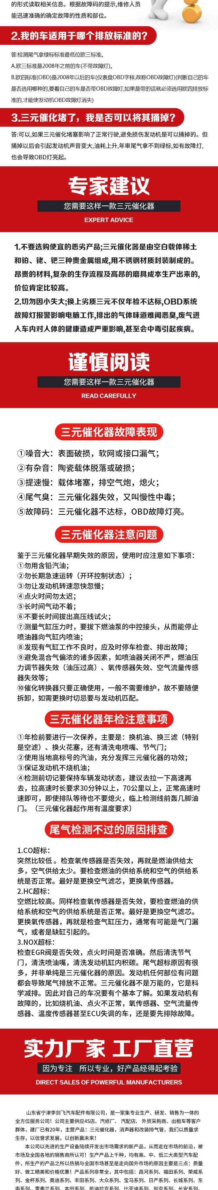 山东宁津剑飞三元催化器有限公司,成立至今已有10年,占地5000平方米,我公司是一家专业生产 销售 为一体的全方位服务公司,公司主要供应4S店 汽修厂 汽配店 出租车等客户群体,还可以根据客户的需求加工定做{必须来样品},根据不同的城市排放标准,为客户推荐适合爱车 当地标准原装位置三元催化器,精益求精、细致造就差别!公司生产的三元催化器选用409耐热不锈钢配以优质陶瓷载体、金属载体组成,产品均为实物拍摄,且均是厂家发货!所以请亲爱的朋友们放心购买。